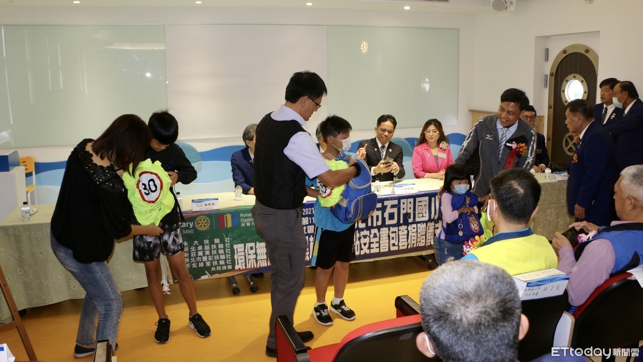 新北永大扶輪社等5大扶輪社聯合捐贈石門區各小學「新交點書包套」,印有「速限30」標示的螢光色外觀,不僅提升學童上下學安全,防水設計更可作為「書包雨衣」。30日由新北永大扶輪社於石門國小辦理聯合捐贈儀式,盼為學子打造更安全的就學環境。
