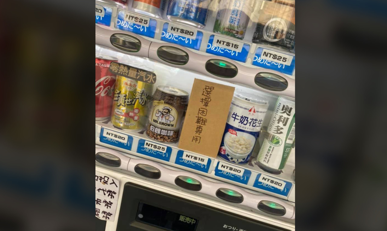 彰化員林出現一台神秘的販賣機,矗立在火車站旁一家彩券行外,外表看似一般,蒐集了台灣常見的罐裝飲料、罐頭,品項五花八門,其中有一格老闆則用紙板寫上「選擇困難專用」,售價只要15元,結果路過民眾一看又驚又喜,直呼「太貼心了」,機台在網路引發熱議,老闆也特地出面解答謎底。