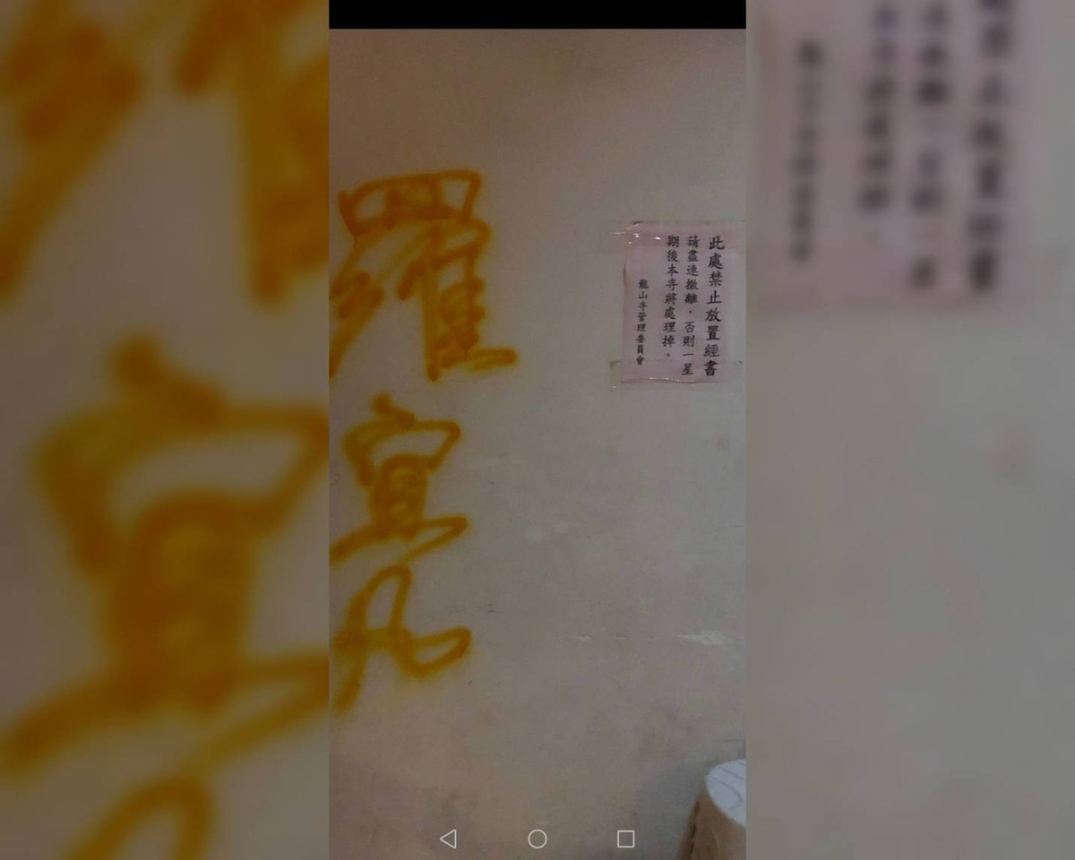 彰化1名洪姓男子1日晚間拿黑色及黃色噴漆,到國定古蹟鹿港龍山寺噴上「羅宜凡」3字被發現報警,警方趕到時洪男手上還拿著噴漆成為鐵證,隨即被帶回,廟方也將提出毀損告訴,至於動機為何、還有噴這3字文字的涵義,都有待警方進一步偵訊釐清,但無論真相為何,噴漆的行為恐怕已涉嫌違反文資法。