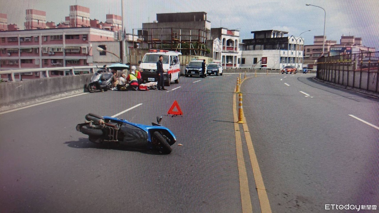 宜蘭市東港橋壯圍往宜蘭市區近中段上橋處,2日中午,一台機車疑不慎,自撞橋護欄基座,撞擊力巨大,機車從外側車道彈落橫躺於內車道,67歲吳姓騎士右手右腳擦傷、骨折及左腳擦傷,躺於外車道上,內車道與外車道散落機車零件碎片,意識清楚的吳男被緊急送醫。