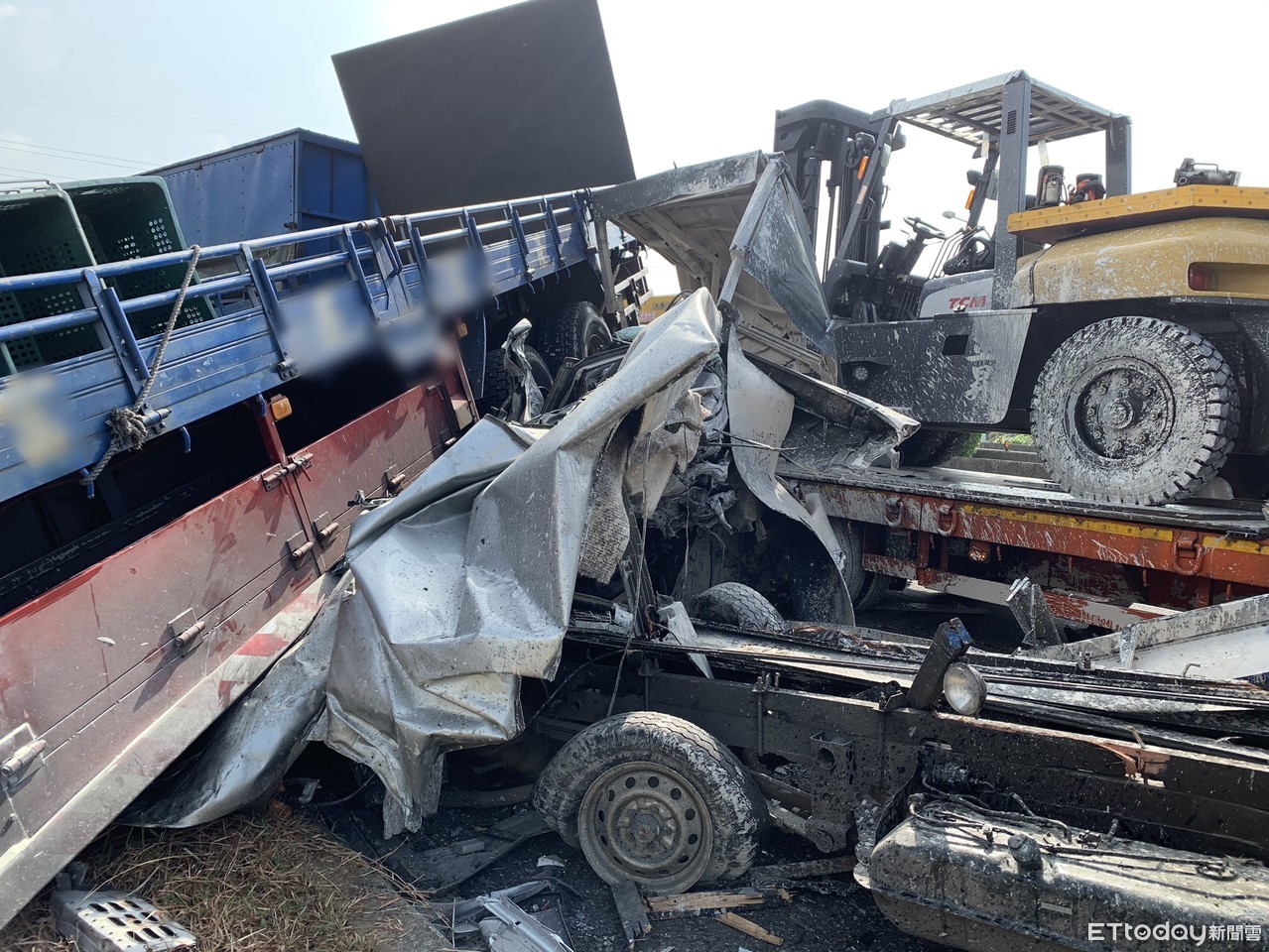這起事件發生在3日上午,事發現場2輛聯結車與3輛自小客撞成一團,其中一輛聯結車因翻覆至邊坡、另輛小客車也卡入聯結車車底。