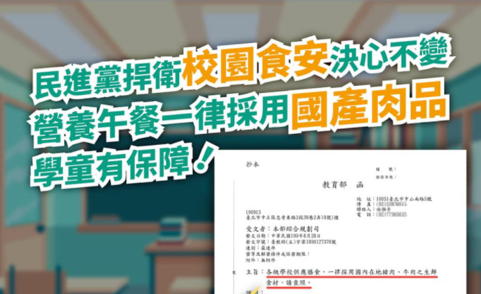 民進黨提到,政府依照現有的《學校衛生法》,配合3章1Q可溯源食材,已運行三年多,未來再加上清楚美豬標示、契約規範廠商,不會有任何進口豬肉進入校園。