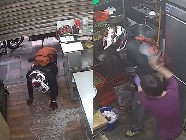 有網友在臉社團「爆廢1公社」貼出監視器畫面,內容顯示老闆娘正在打飯裝便當時,一名戴著安全帽的男子彎腰鑽進半開的鐵門之中,緩慢起身後迅速衝進店內廚房。
