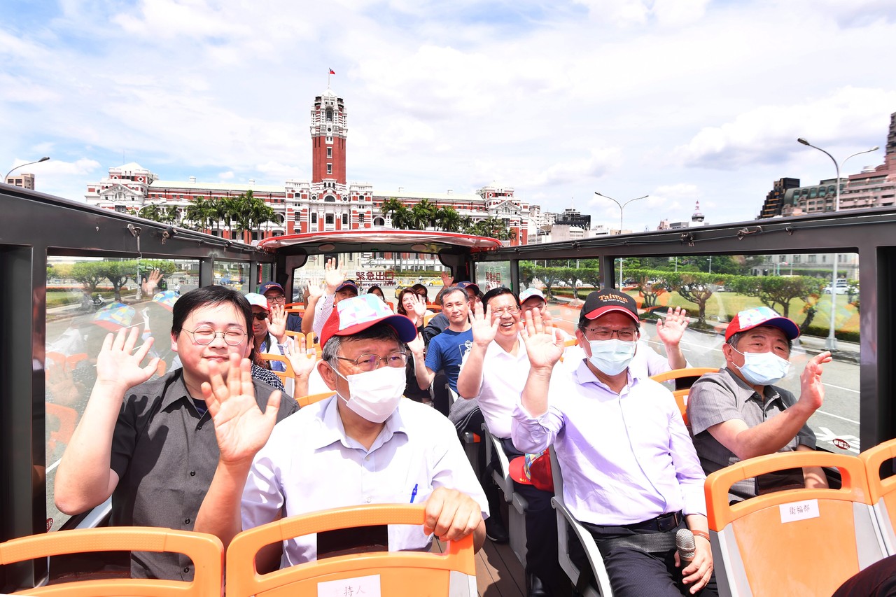 ▲台北市長柯文哲7月與交通部長林佳龍、衛福部長陳時中、觀傳局長劉奕霆搭乘觀光巴士在總統府前合影。(資料圖/北市觀傳局提供)