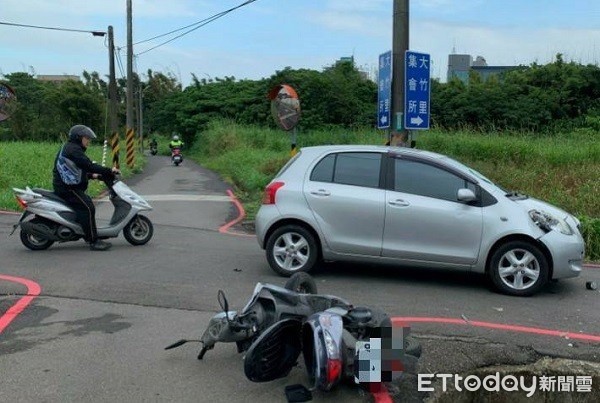 ▲在上班時段疑因路口未減速機車撞小客車。(圖/八德警分局提供)