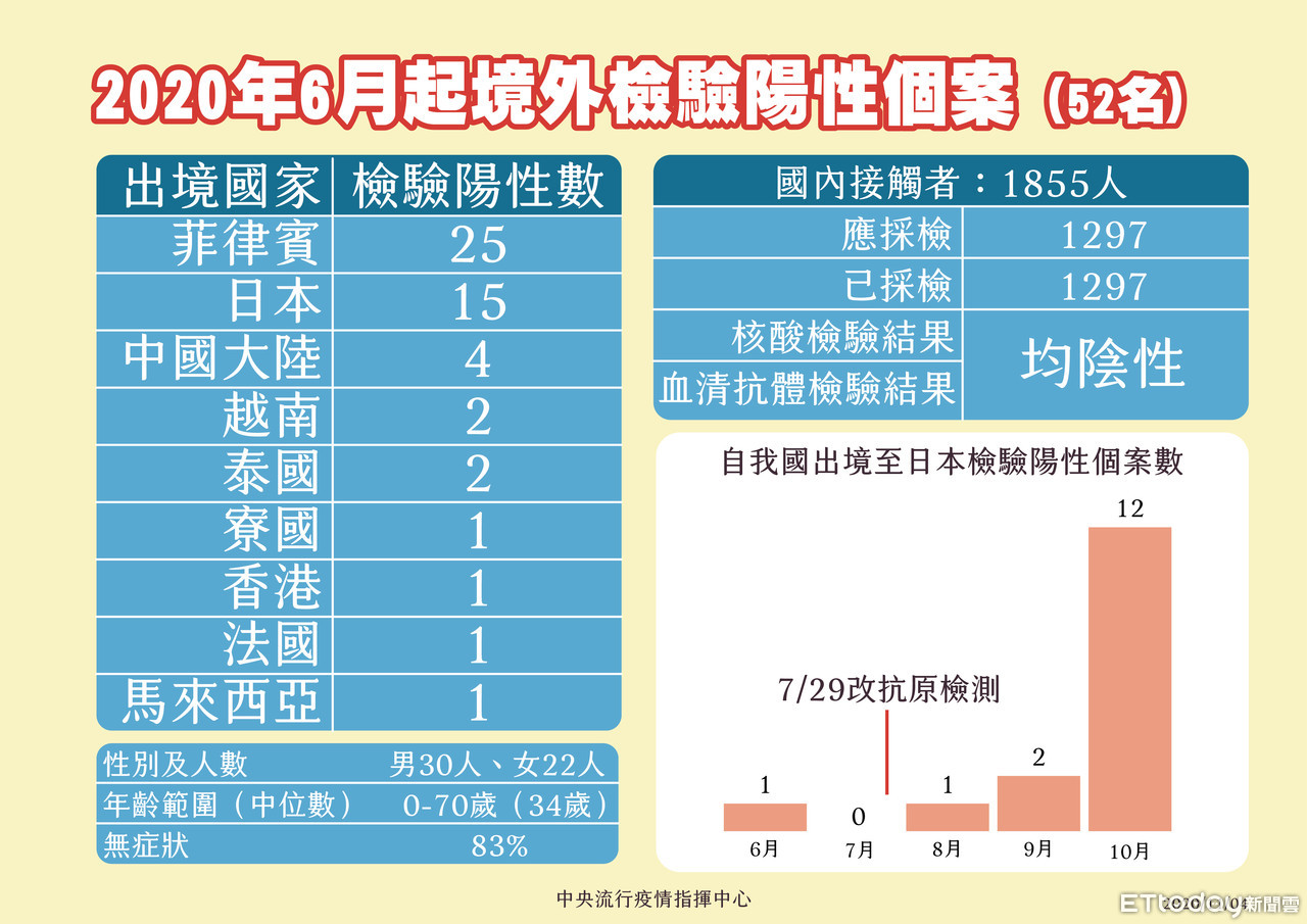 指揮中心今日公布整理從6月已來共有52名境外檢出陽性個案,其中菲律賓檢出25例最多,接著是日本15例、中國大陸4例、越南與泰國各2例、寮國、香港、法國、馬來西亞各1例。