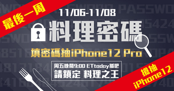 走過路過不要錯過,史上最強大型廚藝選秀節目《料理之王》!除了節目精彩好看,前三周好康大放送活動《料理密碼》也加碼回饋給喜愛《料理之王》的粉絲們,只要觀看播吧《料理之王》第三集節目,記下節目中隨機出現的三組料理密碼,11/6(五)21:00至11/8(日)23:59至ETtoday新聞雲App活動欄填寫密碼,任一組密碼正確即可抽最新iPhone12 Pro手機,三組密碼皆正確,即可獲得三次抽獎機會,快鎖定播吧《料理之王》大獎拿不完!