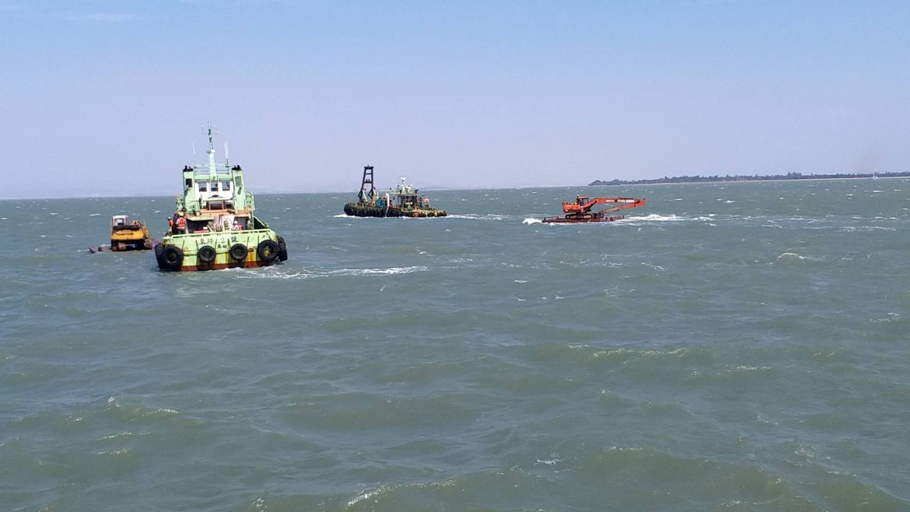 3日傍晚5點接獲東丕公司來電,陸方已拖回2具浮具,最後1具因為結構毀損不耐風浪解體成5塊,剩下的2小塊已隨船拖回大陸,截至目前仍有3小塊在海上漂流。4日再度聯繫東丕公司,回報怪手落海位置大約在JT6航標旁,該處水深約15米,另外和輪船公司聯繫,還沒看到小塊浮箱,研判已經隨海流流到金門南方海域。