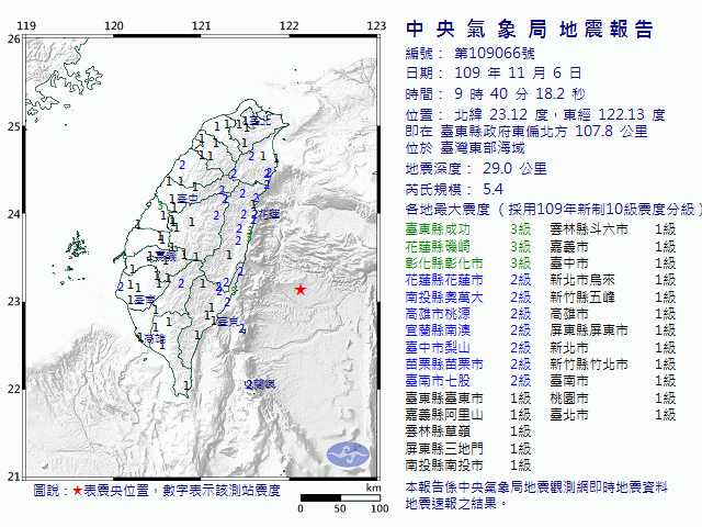 台灣東部今(6日)早上9點40分發生規模5.4地震,震央在台東縣政府東偏北方107.8公里,位於台灣東部海域,深度29公里。