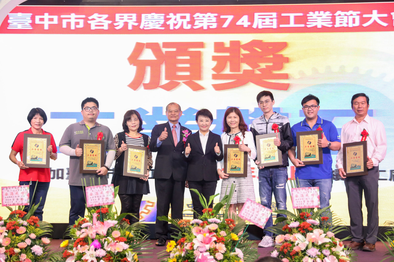 ▲盧秀燕出席工業節大會,表揚141家優良廠商,並且感謝一起拚經濟。(圖/台中市政府提供)