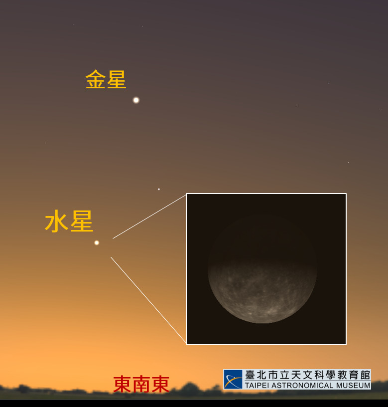 不過,天文館提醒,由於仰角較低,需把握日出前半小時,也就是大約5點半前後觀賞較為適宜,若使用雙筒望遠鏡則更容易看見,透過天文望遠鏡放大觀察則還可見到其如弦月般的外觀。此外,天文館提到,日落後的西方天空也很精彩,除了漂亮的木星和土星即將因接近太陽而無法觀賞外,火星仍在最佳觀察期間,民眾不妨於週末晚間7至9時,來天文館用大型望遠鏡仔細端詳這顆神秘的行星。
