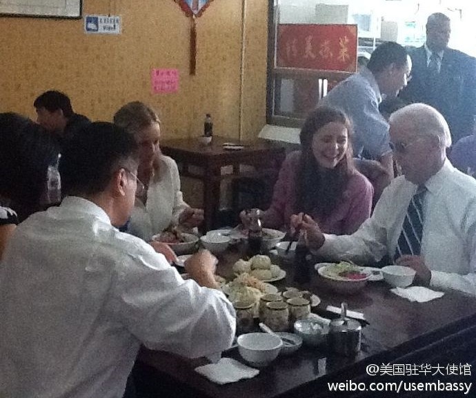 美國駐華大使館貼文中更介紹,副總統拜登在時任駐華大使駱家輝的陪同下,和孫女一起品嘗北京炸醬麵,拜登還熱情地和邊上其他顧客打招呼、介紹自己的外孫女,之後更和顧客及店員拍照留念。