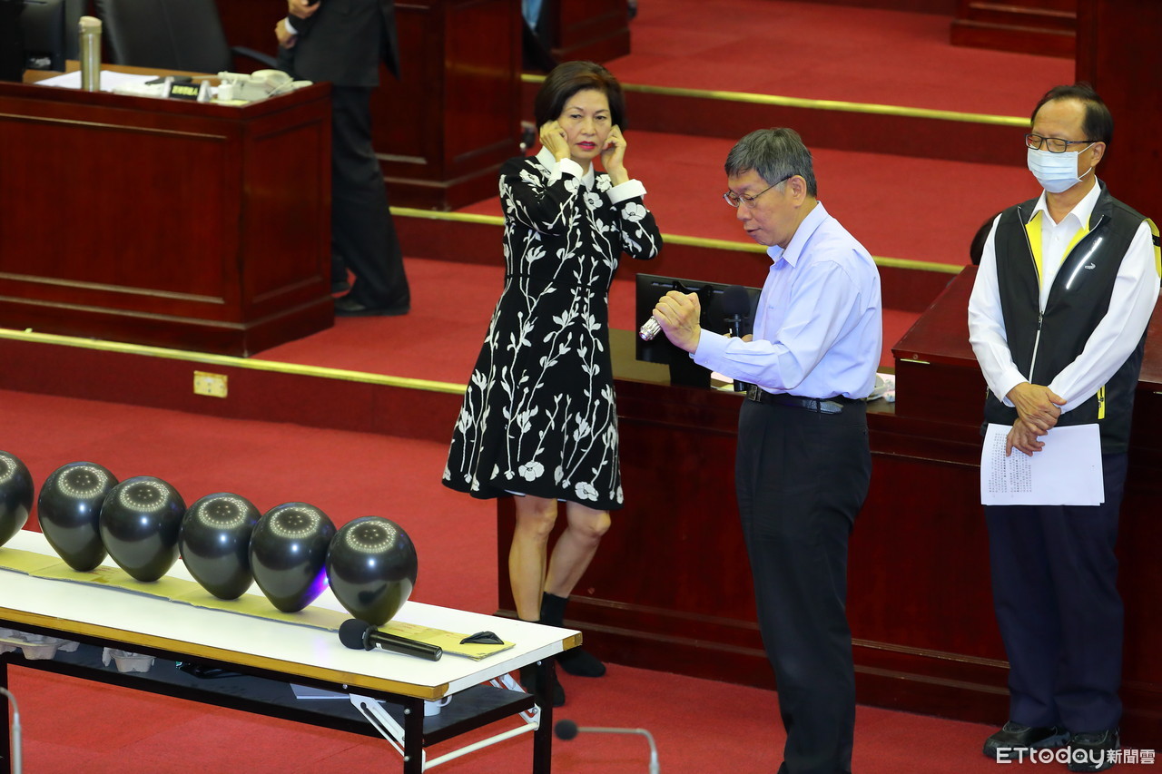 鍾沛君在議場擺置5顆氣球,要柯文哲實際測試「激光炮」,只見柯文哲拿激光炮照射氣球後,每顆氣球都瞬間爆破。對此,柯文哲直言,這款雷射筆具有破壞力,「應該算是武器吧!」