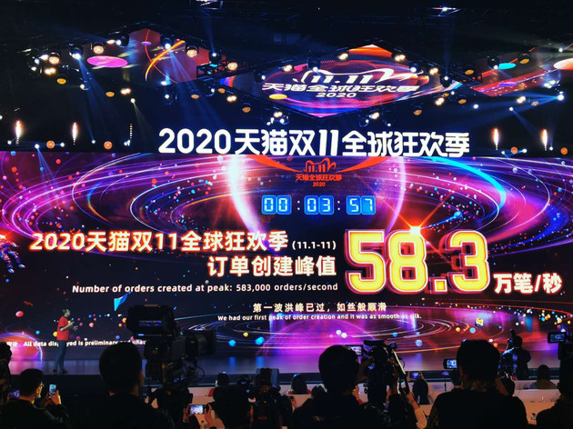 2020天貓雙11有別以往,分成2波銷售期,共有25萬品牌、500萬商家參與其中。根據實時交易數據,11月1日至11日之間,雙11訂單成立的最高紀錄高達每秒58.3萬筆。