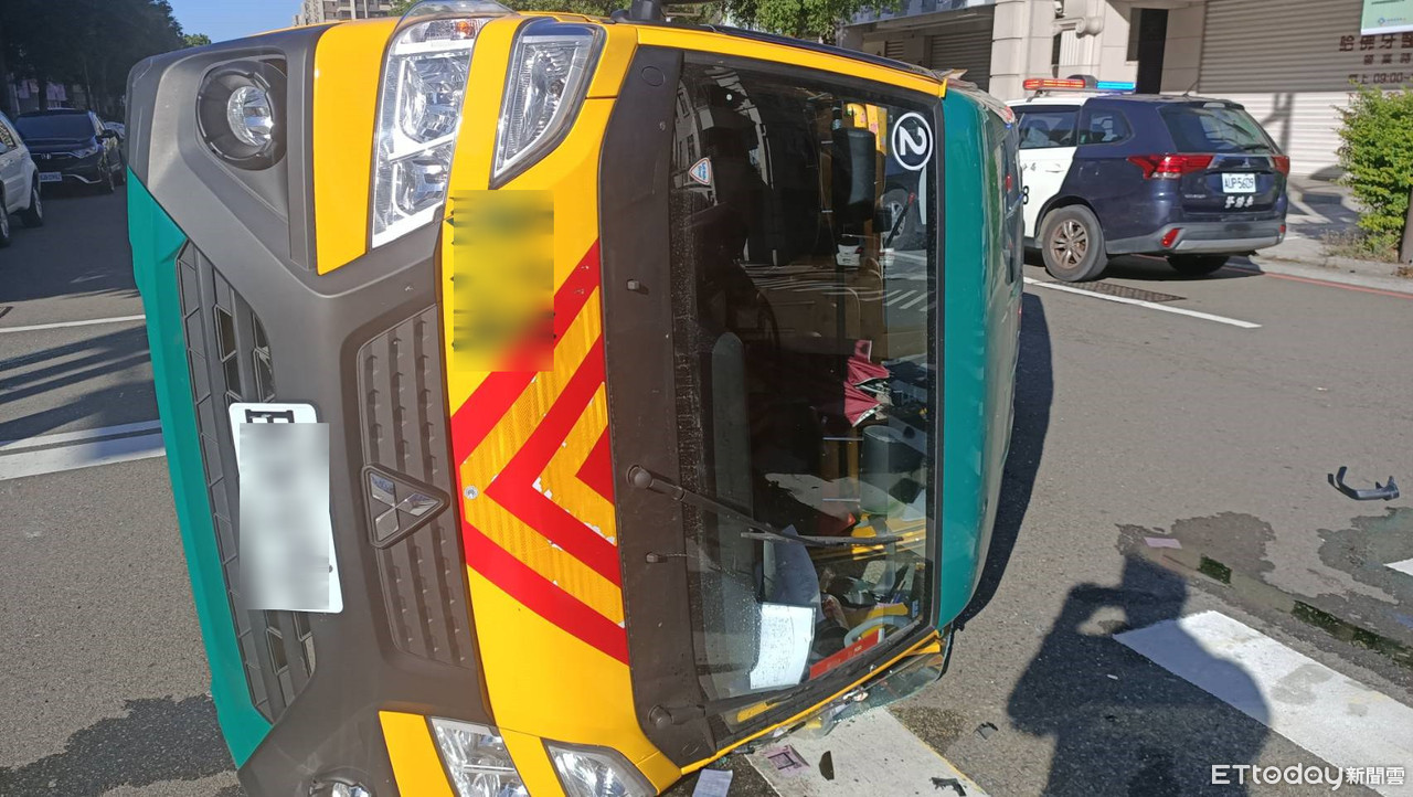 ▲1輛娃娃車遭到闖紅燈女駕駛攔腰撞上當場翻覆,車上3名學童及老師受傷送醫。(圖/記者黃孟珍攝,下同)