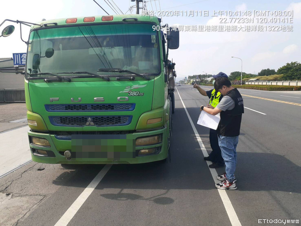 ▲屏東縣里港警分局會同縣環保局在里嶺大橋旁道路對砂石車聯合稽查 。(圖/記者陳崑福翻攝,以下同)