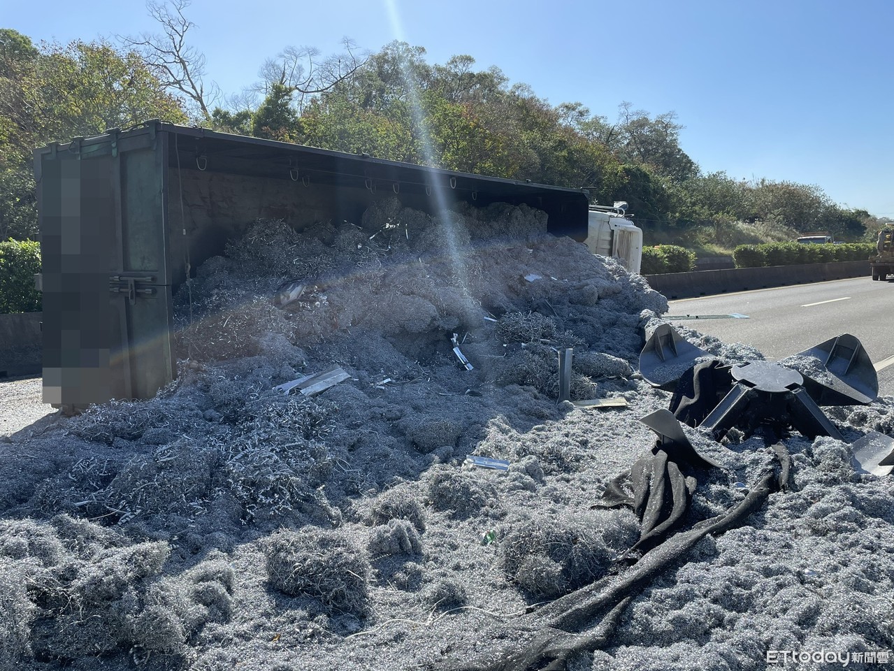 ▲貨車上的鋁屑堆落在3個車道上,目前只剩路肩可通行。(圖/記者陳凱力翻攝,下同)