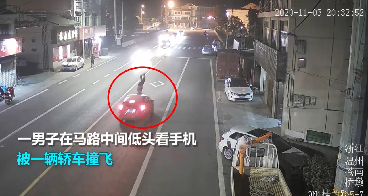 根據澎湃新聞報導,溫州蒼南縣一名劉姓男子3日在路邊用手機,眼見兩邊沒車,就隨意穿越馬路,但他走到路中間時,剛好講完電話,竟然就停了下來,站在原地低頭用手機,期間有一輛車先閃過,但他仍然沒有動,過了20秒就被撞飛。