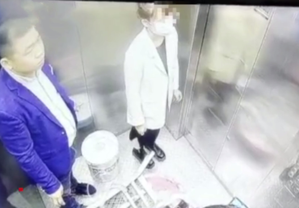 ▲兇手和其中1名女死者在電梯中。(圖/翻攝自影片)
