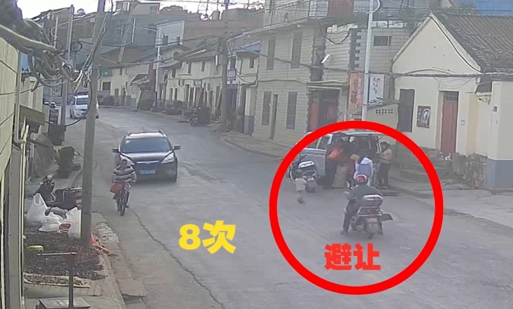 監視器畫面中可見,穿著粉色衣服的小女孩不斷在馬路上來回跑著,期間順利閃躲許多輛轎車、摩托車、電動車;直到第十趟,小女孩正轉身準備加速穿越馬路時,被一輛白色越野車撞上,女孩的媽媽聽到聲音衝上前查看。