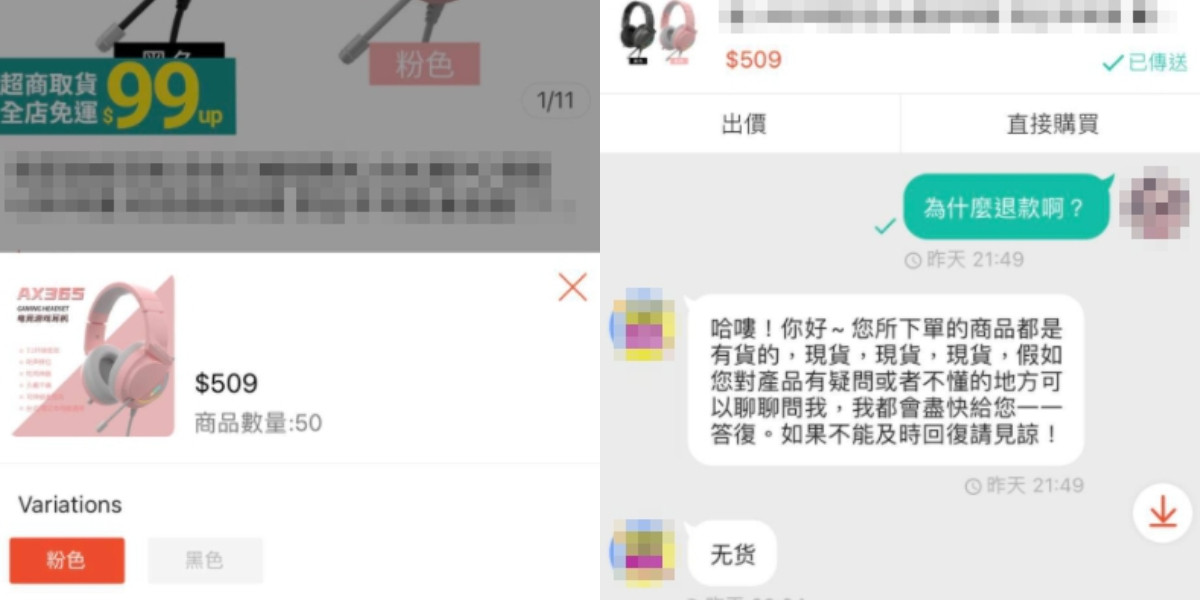 一名女網友在臉書《爆怨2公社》開頭便大罵「真的很沒品」,原來10日時,原PO搶先買了一款粉色耳機,搭配雙11免運與折扣優惠,只要244元,CP值看似爆棚。怎料原PO下標後,也完成付款程序,買家12日無預警取消訂單,接著用簡體字回應「無貨!」