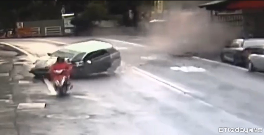 ▼小客車撞擊後還彈往機車方向,騎士險些遭撞。(圖/記者唐詠絮翻攝)