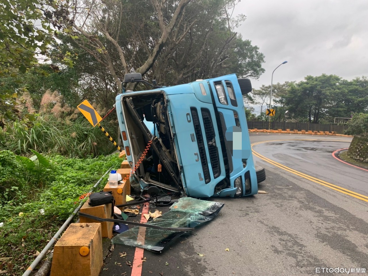 ▲水泥預拌車在泰山山路上疑似機械故障自撞翻覆。(圖/記者陳豐德翻攝)