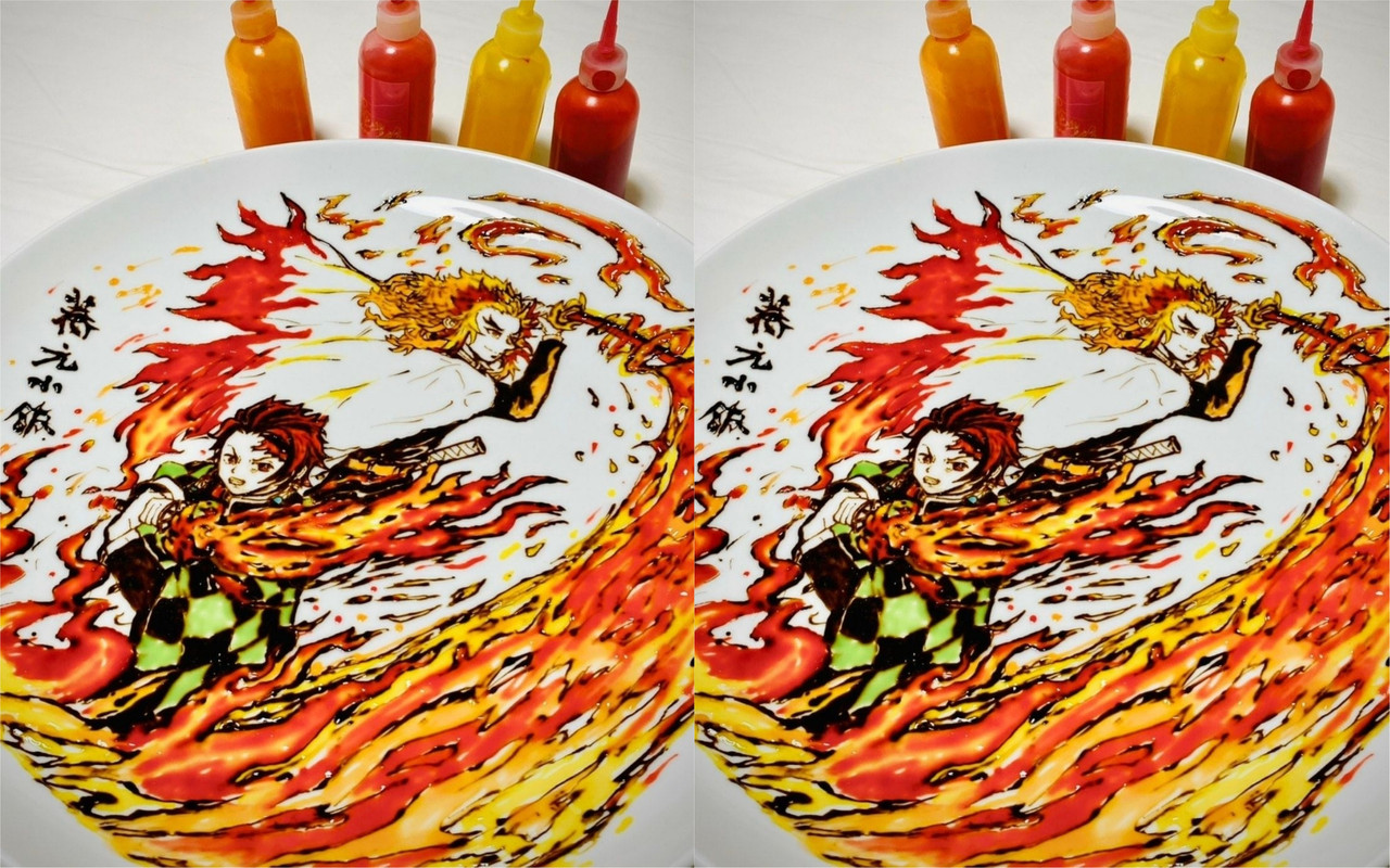 近日餐廳粉專宣布帶來客製化特殊盤飾彩繪服務,凡點桌菜包廂金額$8000元以上,可以在粉專私訊跟老闆說想指定畫的內容,並PO出一張彩繪餐盤照分享。只見白色餐盤上,老闆以醬料畫出「鬼滅之刃」的炭治郎與杏壽郎被熊熊烈火包圍的畫面,幾乎100%完美復刻,還興奮附文表示,「最近看了鬼滅之刃無限列車的電影版! 真的做得太棒了,煉獄大哥太帥了!」」