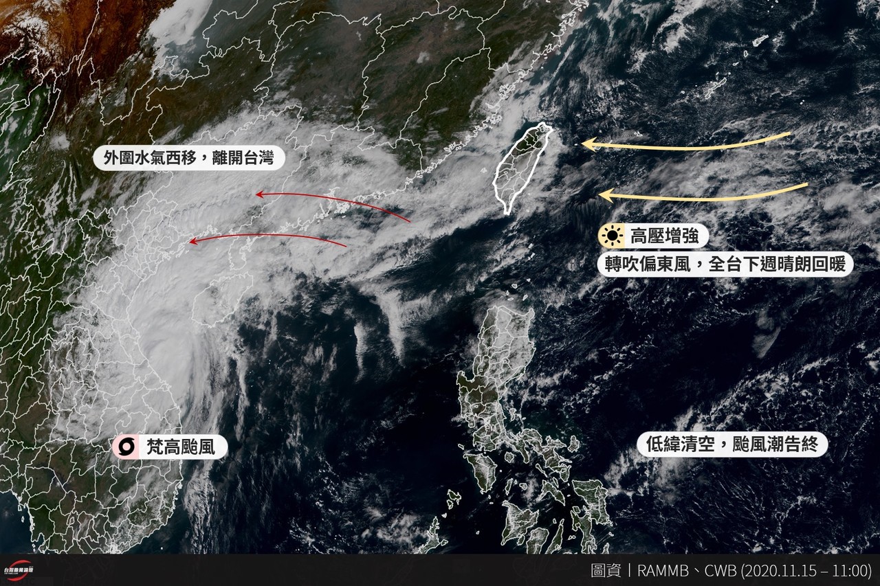 臉書專頁「台灣颱風論壇|天氣特急」指出,隨著梵高颱風西移,台灣上空水氣逐漸清空,全台各地陸續回暖轉晴。展望下星期,太平洋高壓再增強,台灣上空會改吹溫暖的偏東風,全台各地天氣好,大幅回暖,除了宜蘭、花蓮迎風面,偶爾還是會飄雨。
