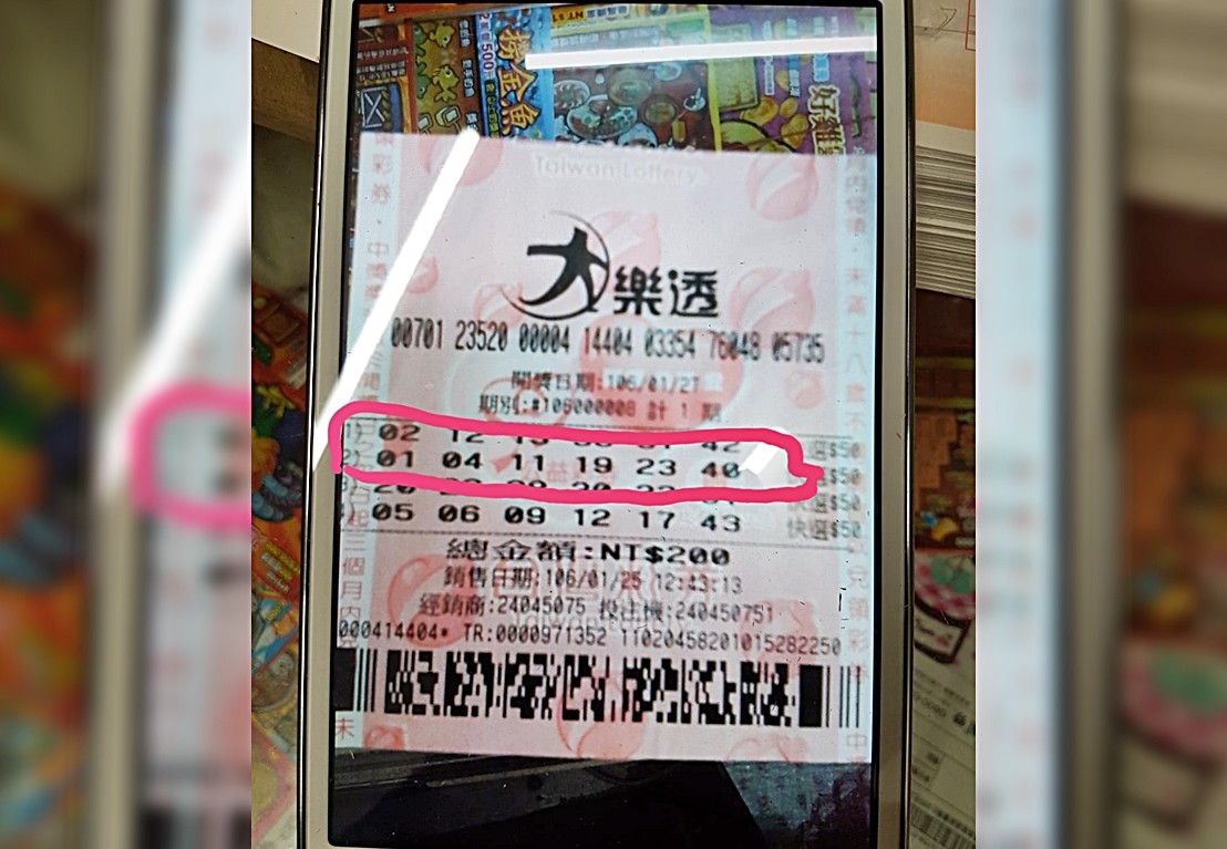 王姓網友13日透過「爆廢1公社」曝光一張中獎彩券,2017年1月25日他趁著過年加碼期間,到彩券行以200元買了電腦選號「快選4組」大樂透,27日開獎後一兌獎,發現其中一組「01、04、11、19、23、40」號碼幸運中獎, 對中「春節百萬大紅包」加開的10號中第4組號碼,當場樂壞了!