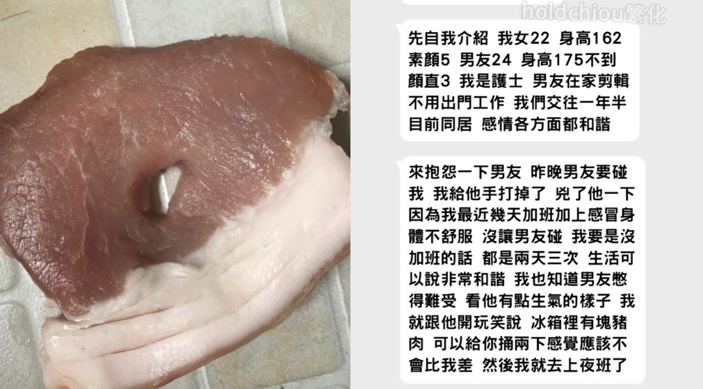 原PO表示,知道男友憋得難受,就向他打趣「冰箱有塊豬肉,可以給你桶2下感覺應該不會比我差」,結果隔天回家要做飯時,發現豬肉的包膜被拆開,而且上面還多了一個洞。
