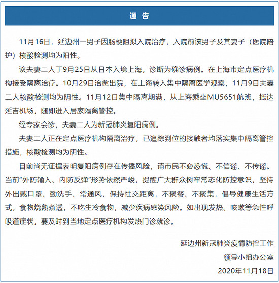 據《延邊發佈》微信公眾號18日通報,吉林延邊州新冠肺炎疫情防控工作領導小組辦公室通報,11月16日,延邊州一男子因腸梗阻擬入院治療,入院前該男子及其妻子(醫院陪護)核酸檢測均為陽性。據悉,該夫妻從日本入境上海,隨後確診進行隔離治療,之後治癒出院,沒想到再次復陽。