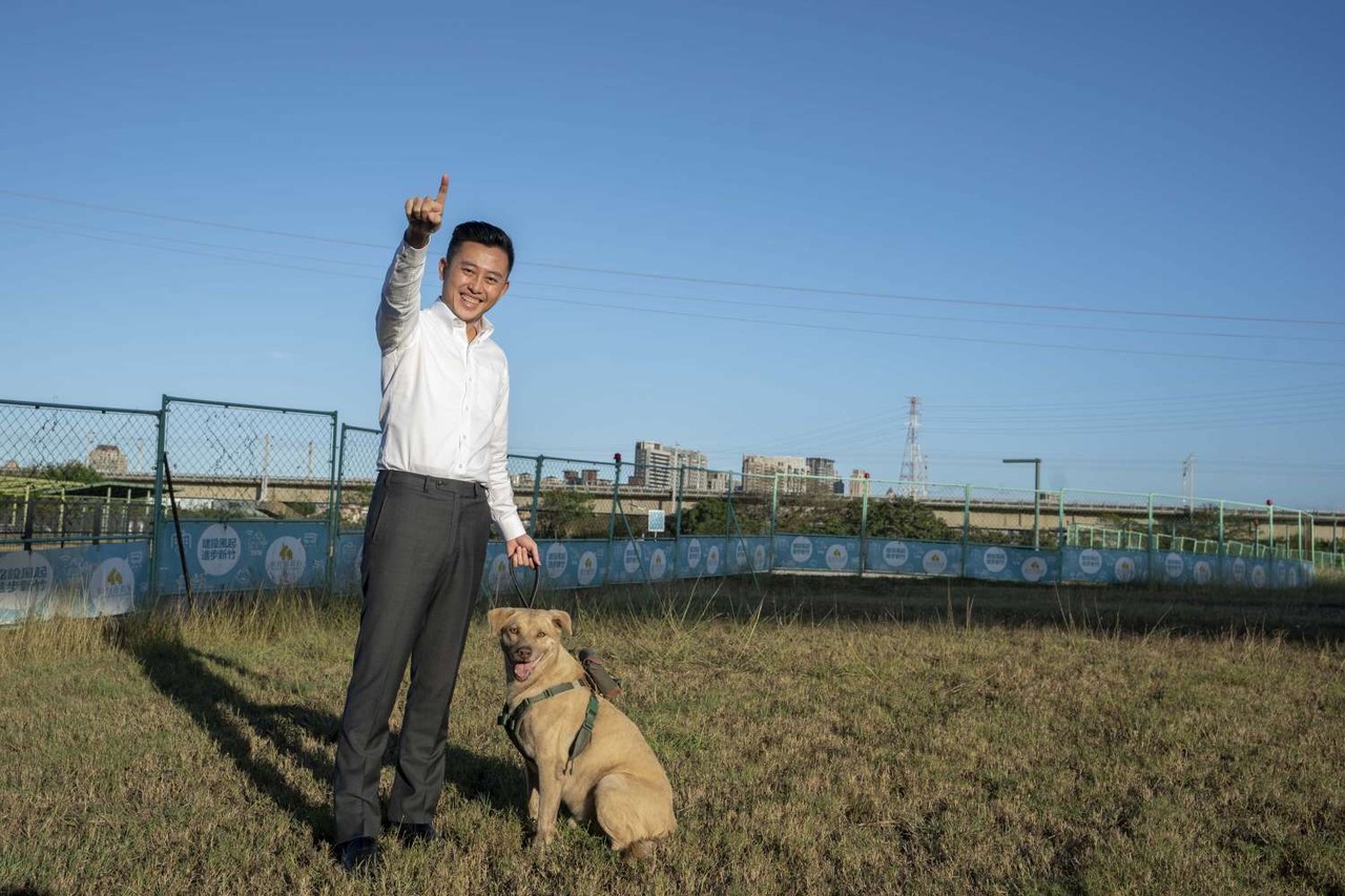 ▲新竹市長林智堅帶著市犬「棕棕」視察佔地約1.16公頃的狗狗秘境。(圖/新竹市政府提供)