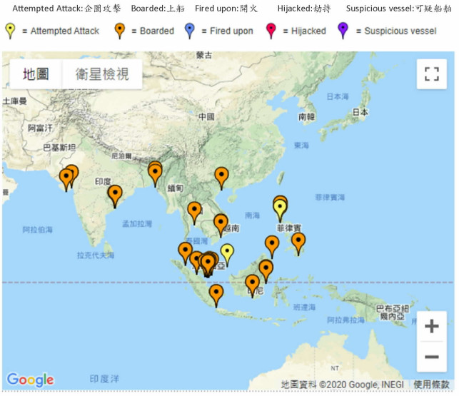 交通部航港局公告「受海盜或非法武力威脅高風險海域」範圍,包含東南亞地區的「南海、菲律賓、印尼、泰國灣、麻六甲海峽、新加坡海峽、孟加拉與印度」等附近海域。
