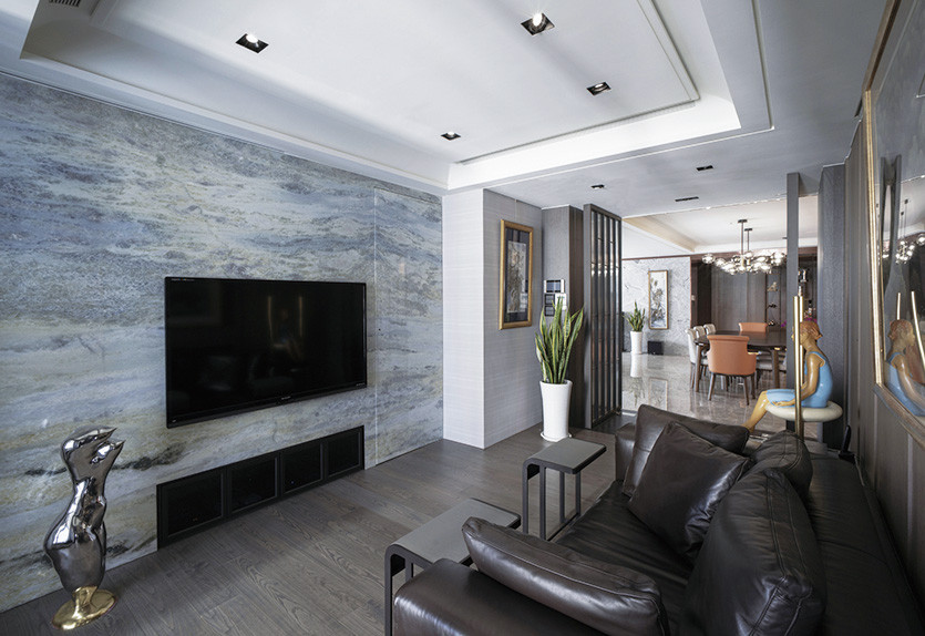開放規劃的公共空間大器舒朗,相輔相成的單元機能呈長軸串連,共享大面窗的高樓層景緻令人心曠神怡,設計者以材質差異的深淺,塑造穠纖合度的造型、量體比例,使官能感知沈穩而不滯重,內斂奢華卻不減溫暖,特別是在黑灰白加木、石為主軸的低限色溫中,適度穿插條紋玻璃的清透、鐵件線條的俐落,以及局部鍍鈦玫瑰金框邊的奢華之美,從而特調獨一無二的空間性格。