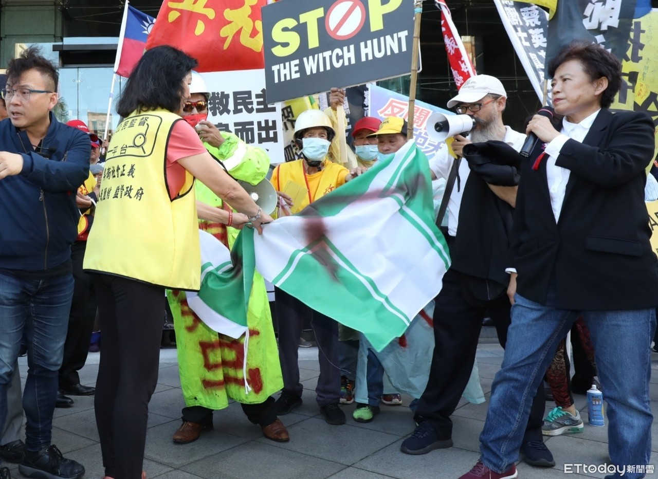 ▲民間團體公民監督平台到NCC抗議下架中天新聞台,對民進黨旗噴漆並撕毀,並相約一起參加1122秋鬥遊行。(圖/記者屠惠剛攝)