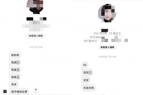 依據女子貼出的照片,一共有2個帳號私訊她,第一個帳號傳送了「欸欸欸」、「我是X(名字)」、「安安」、「我手機放店裡」等訊息,第二個帳號則是傳了「Kk」、「我是X(名字)」、「安安」、「有看到嗎」等訊息,看起來就像要找人。