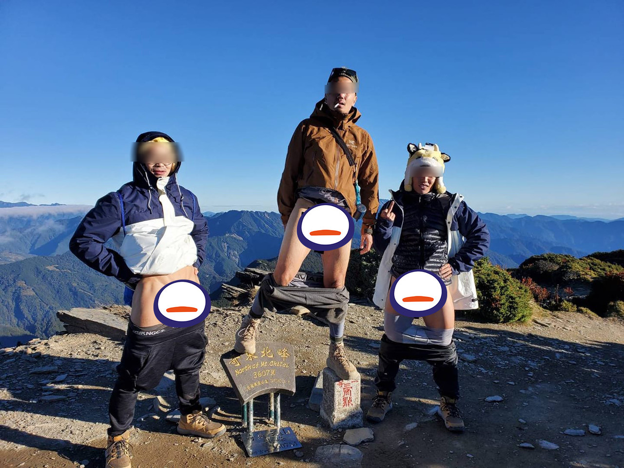 網友在臉書社團PO文寫下「靠北啦!遮住怎麼比大小支」,一旁附上的照片中,只見3名男子在奇萊北峰3607公尺的三角點處拍照留念,但3人均將褲子、內褲褪至膝蓋處,大方將生殖器裸露在寒風中,且中間的男子更是肆無忌憚地將三角點與標誌牌踩在腳下,口中還叼著一根菸,雖然3人重要部位被打上愛心圖樣遮掩,但照片曝光後仍引起山友熱議。
