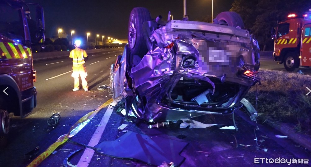 國道1號南下166公里、台中豐原路段今天(22日)凌晨發生重大車禍,一輛休旅車自撞護欄翻覆,造成車上6男4死、1重傷、1輕傷。如今事發畫面也曝光,只見整輛車四腳朝天幾乎全毀。