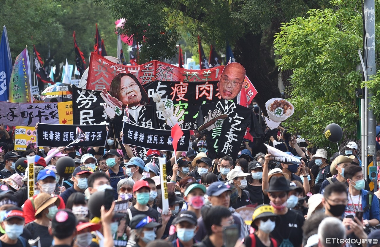 2020秋鬥遊行22日下午登場,今年以「反萊豬、反雙標、反黨國」為主軸,遊行隊伍行經立法院、行政院,最後終點為民進黨部,主辦單位預估,現場約5萬人參與。