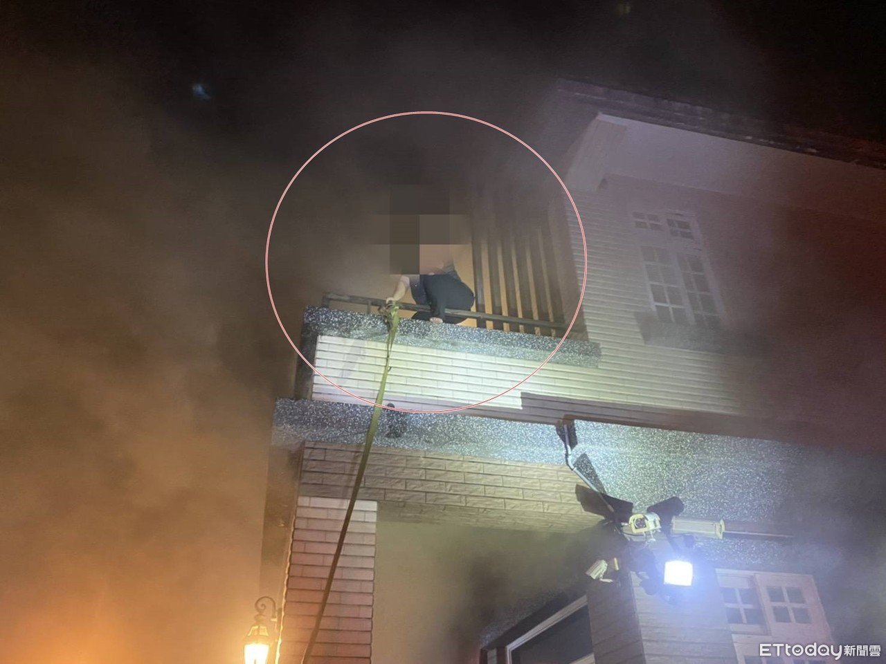 ▲▼警消架梯從民宅2樓陽台搶救下受困輕微嗆傷、意識清楚的47歲郭女(紅圈處)。(圖/記者游芳男翻攝,下同)