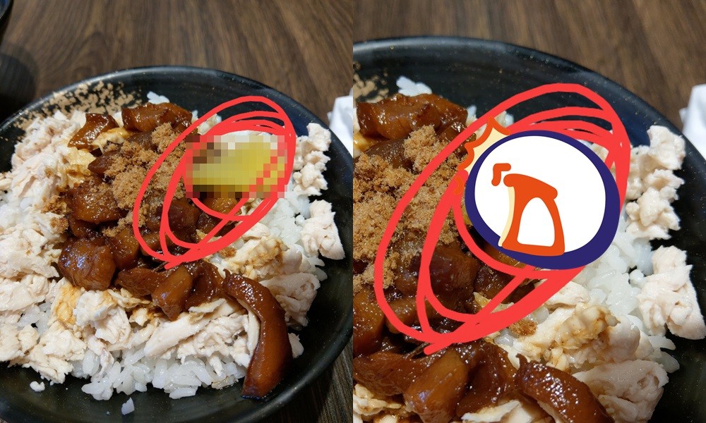 仔細看看照片,白飯上先是舖了一層雞絲,接著淋上滷肉,最上面還放了一些肉鬆,以及一小片黃蘿蔔。結果原PO就用紅色畫筆把黃蘿蔔瘋狂圈起來,抱怨說這是比香菜還討厭的東西。貼文馬上引發共鳴,「什麼都好,就是不愛醃黃蘿蔔」、「我也是,沾到飯我會不爽。」