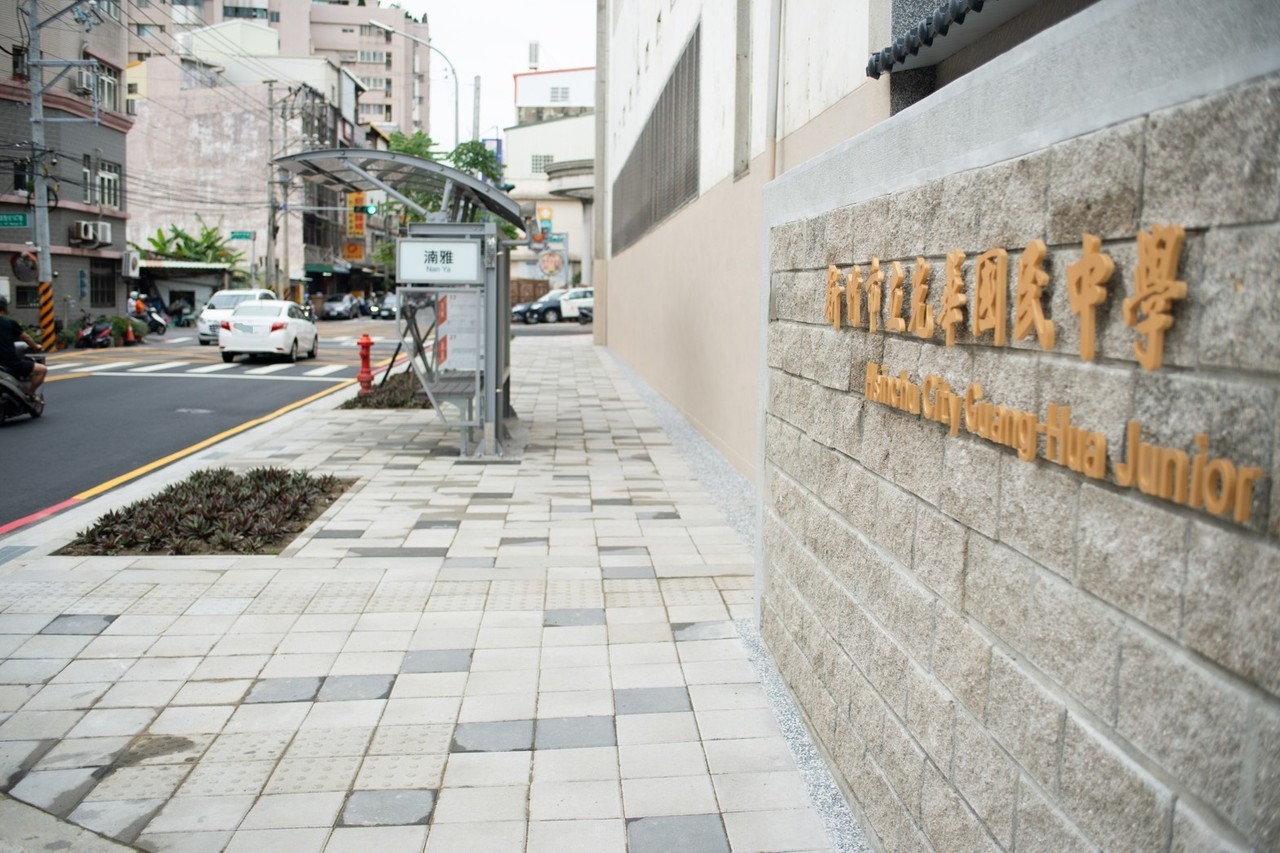 新竹國小在南大路及興學街交接處,後方則是興學公園綠廊帶及振興路橋,人、車流量大,現行通學步道同樣未全面串聯,加上有步道上有電線桿、植栽根部隆起等,阻礙步行,校方同樣盼打造無障礙、人車分流通學步道,更結合後方綠廊帶,讓學生、居民都有完善步行空間。