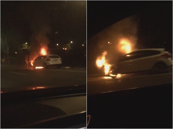 南投交流道口(南下中寮段)23日晚間發生火燒車事故,一輛白色自小客車停靠路旁,引擎部分起火狂燒,路過民眾表示聽到爆炸聲,現場非常可怕。