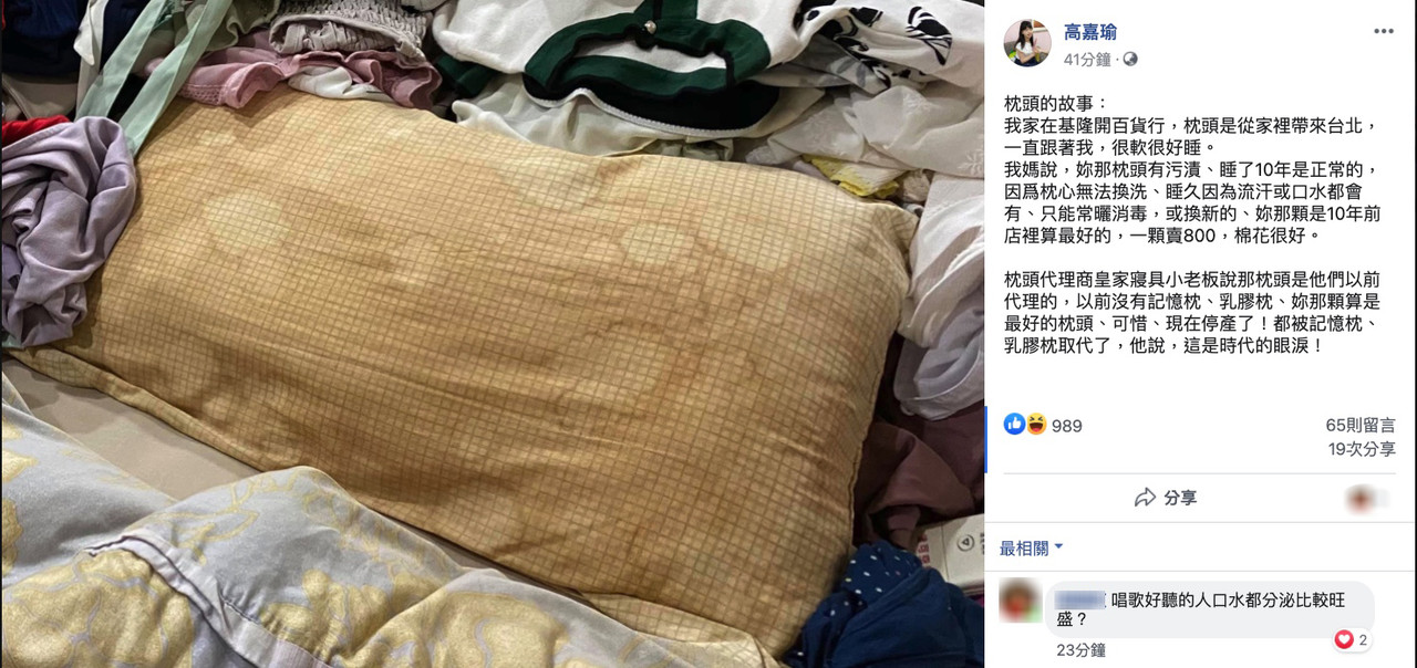 高嘉瑜24日在臉書發文「枕頭的故事」,表示她家在基隆是開百貨行,枕頭是從家裡帶來台北「一直跟著我,很軟很好睡。」不過由於枕心無法換洗,所以睡了10年上面有污漬、口水印都很正常,只能常曬、消毒。