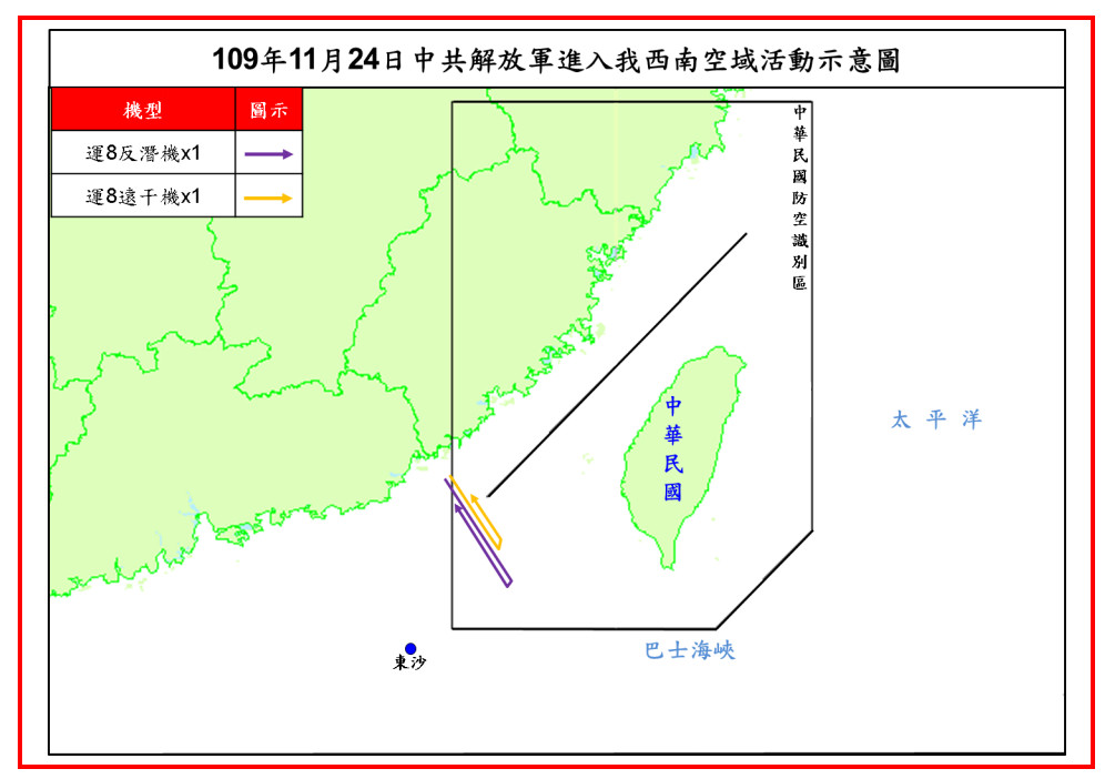 根據國防部11月軍事即時動態資料顯示,11月共累計35架次共機,分別是11月1日運8技術偵察機1架次;11月2日運8反潛機1架次、運8技術偵察機1架次、蘇30機2架次、殲16機2架次、殲10機2架次;11月3日運8反潛機1架次;11月4日運9通信對抗機1架次;11月5日運9通信對抗機1架次、運8遠干機1架次、運8反潛機1架次;11月6日運8遠干機1架次;11月10日運8反潛機1架次;11月11日運8技術偵察機1架次、運8反潛機1架次。