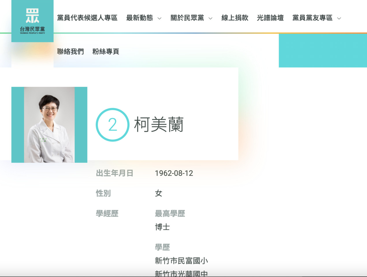 ▲柯文哲妹妹柯美蘭參與新竹縣黨代表選舉。(圖/取自民眾黨黨代表選舉公報網站)