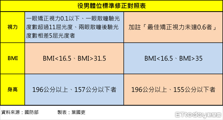 為了擴大兵源、廣儲後備,國防部日前預告將修正役男「體位區分標準」,其中身高、視力、BMI都有修正,免役條件更為嚴格。
