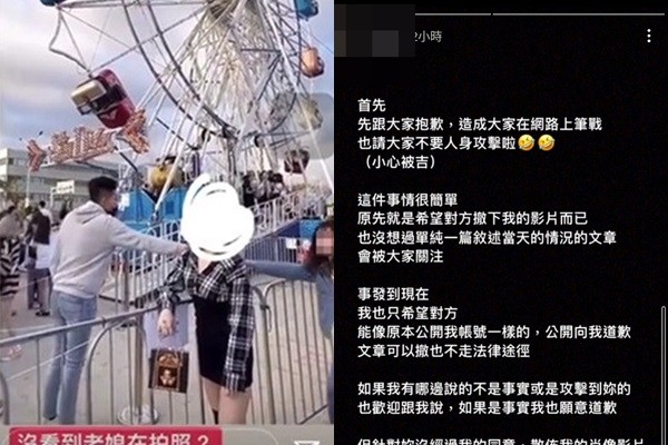 情侶妹在IG限動上寫道,「先跟大家抱歉,造成大家在網路上筆戰,也請大家不要人身攻擊啦,小心被吉。這件事情很簡單,原先就是希望對方撤下我的影片而已,也沒想過單純一篇敘述當天情況的文章,會被大家關注。」