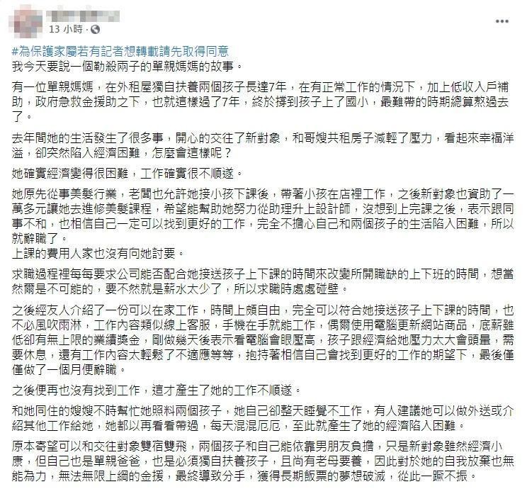 該友人指出,吳女獨自在外租屋撫養兩個孩子,靠著工作收入和,低收入戶補助、政府急救金援助之下過了7年,終於撐到孩子上了國小,而她也有了新的交往對象,再加上與哥嫂共租房子,減輕房租壓力,「看起來幸福洋溢,卻突然陷入經濟困難,怎麼會這樣呢?」